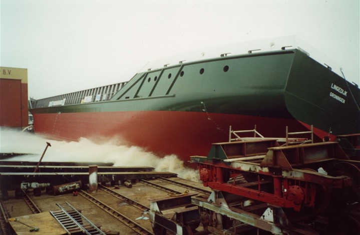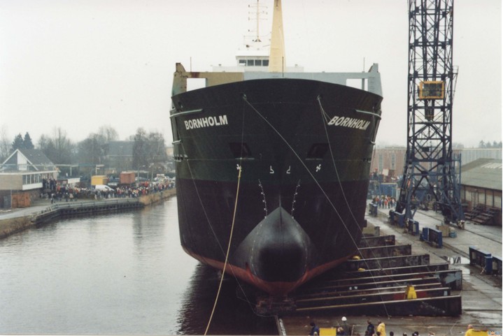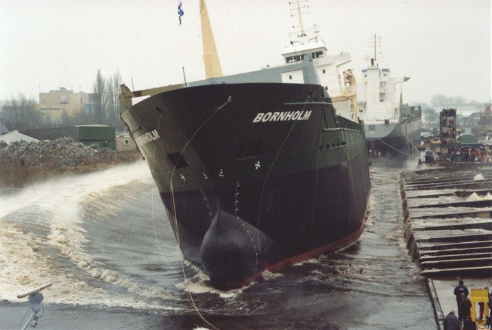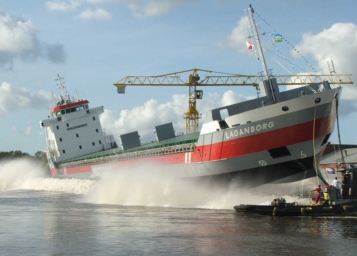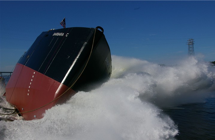 新船侧滑下水,一般适用于中小型船舶。但百十米长,数十米高,由上万吨钢铁构成的庞然大物瞬间倒向水中,激起排空巨浪,又快速自动扶正,几经剧烈摇摆,最后终于驯服地安静下来,这静--动--静的过程,还是給人以强烈的视觉冲击和心灵震撼。所以每条新船下水,都是船厂的节日。