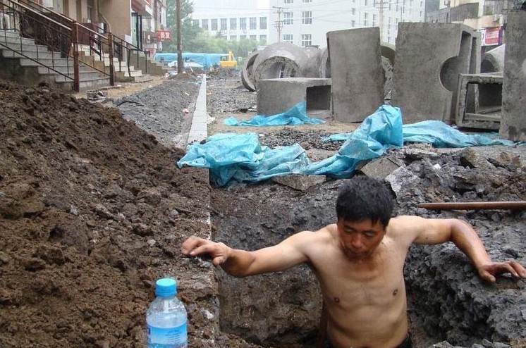 炎炎夏日,一条马路正在开挖地下接口,劳工们光着膀子干得正欢