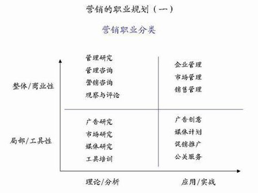 可见,在企业中的“品牌经理”、“市场经理”等职位更多偏重在营销应用及整体把握上(其中职位越高整体性越强,比如说品牌经理是针对某一个品牌/产品,而市场经理是对业务的营销规划等,到总经理是对全面经营管理进行负责);而广告/公关等服务公司虽也是针对应用来工作,但主要在某一种工具和方法;调研公司等提供数据支持和分析,以及咨询公司提供全面的商业分析,也很容易理解。