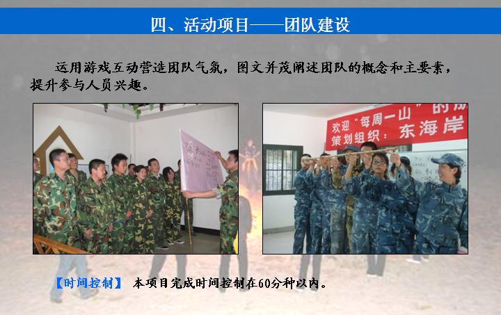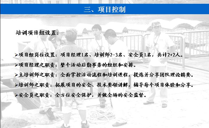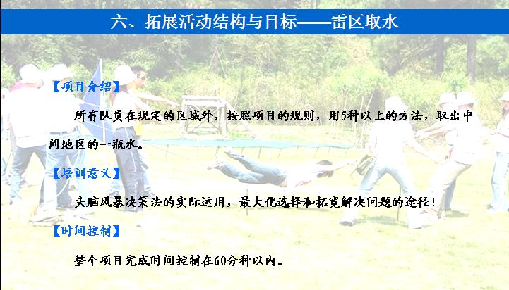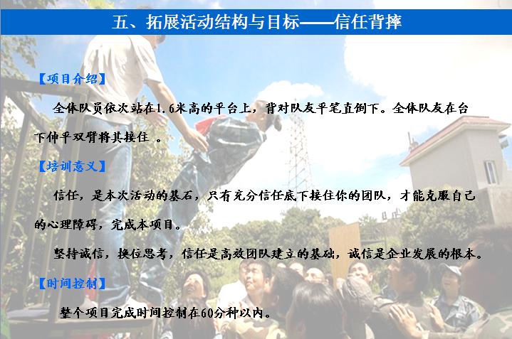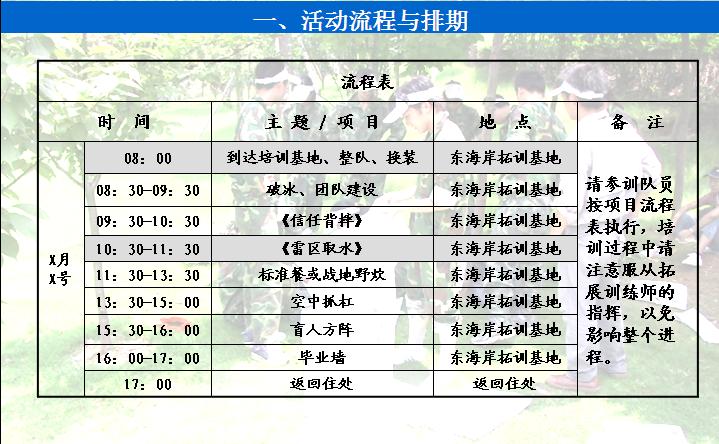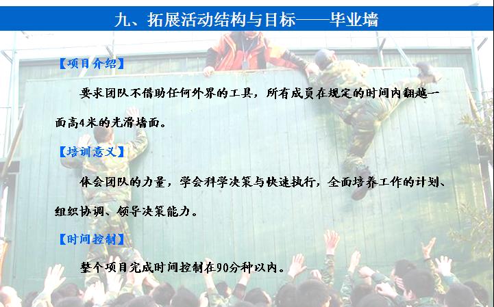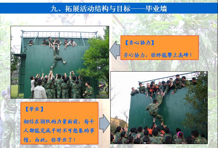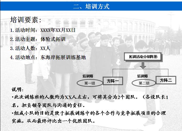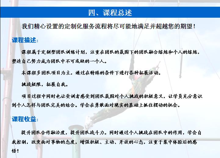 二、训练口号:挑战自我、熔炼团队,在个人提升的基础上,建设和发展团队(或客户自定)。