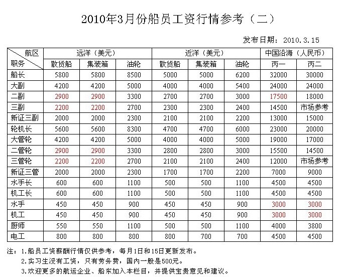 当前位置:爱博仁人力资源官网 >> 最新公告 >> 2010年3月下旬船员工资行情参考