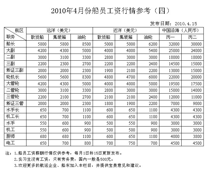 另:以上工资水平是通用海员岗位薪酬体系,具体到每一个岗位的薪酬实际值可在每个实时发布的招聘职位页面中看到,该数据是本站一大技术创新点,所显示的数据是经过科学算法得出的,具有实时参考性。