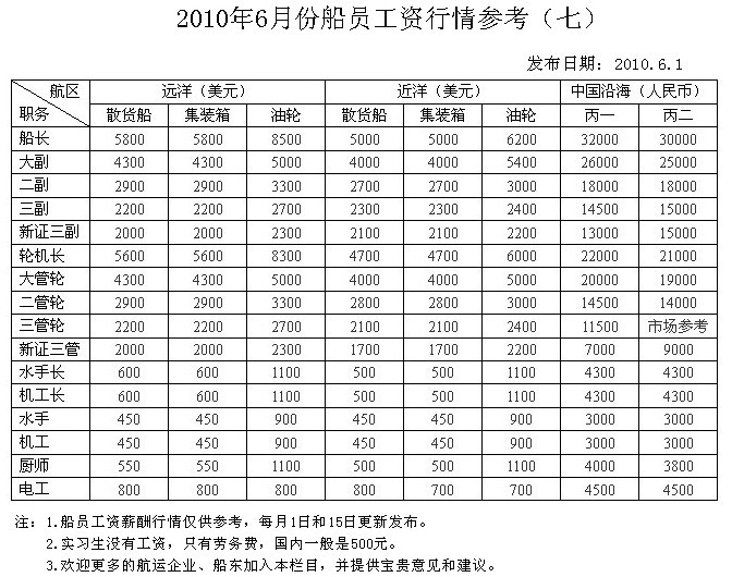 当前位置:爱博仁人力资源官网 >> 最新公告 >> 2010年6月上旬船员工资行情参考