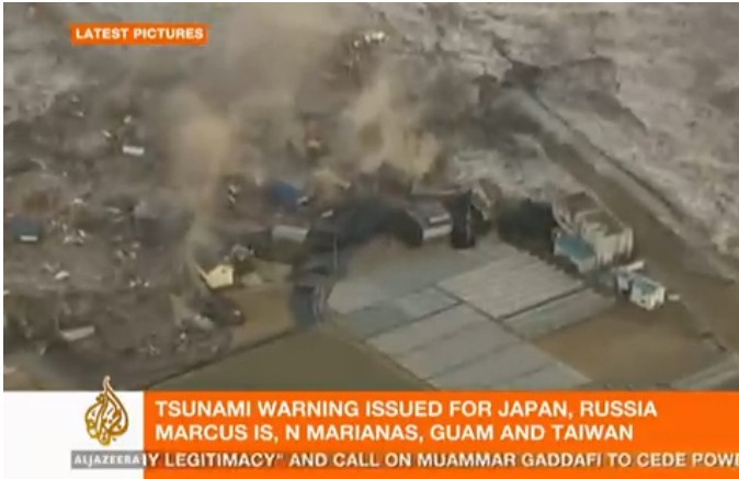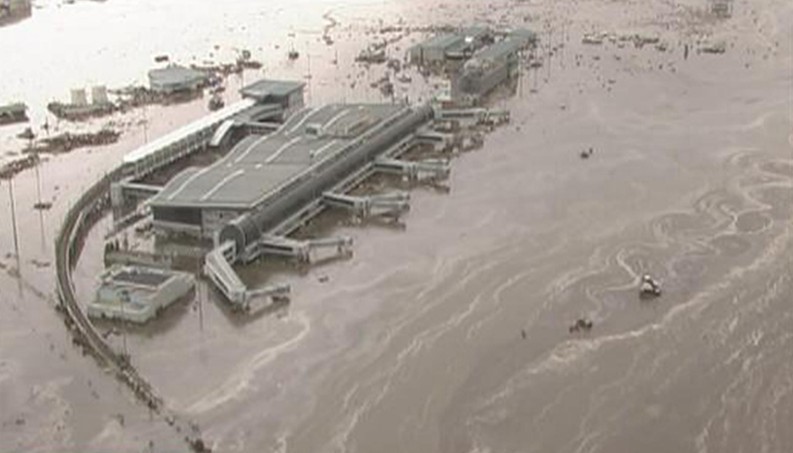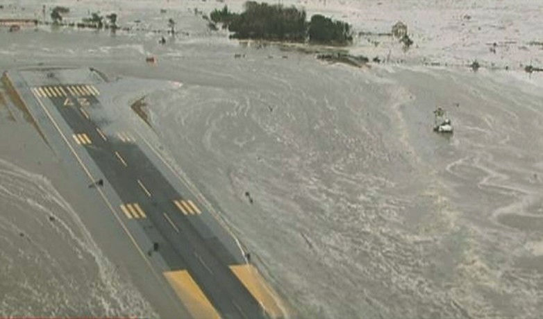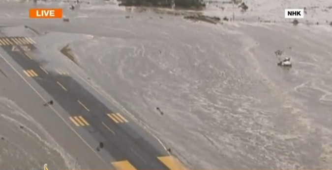 截图显示的是日本仙台机场因海啸侵袭的情景