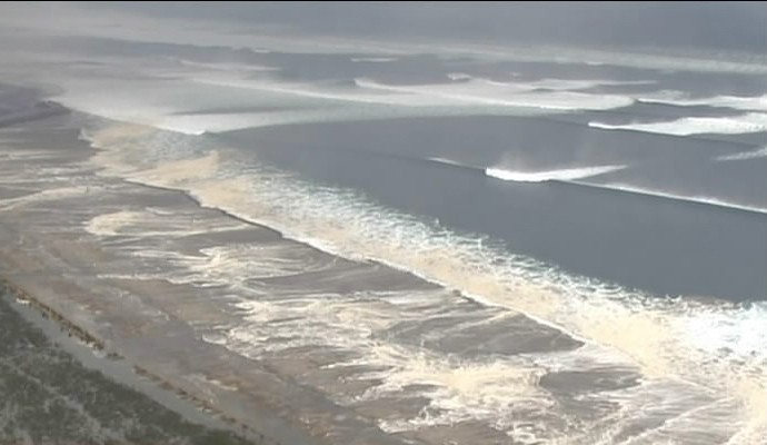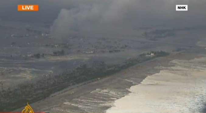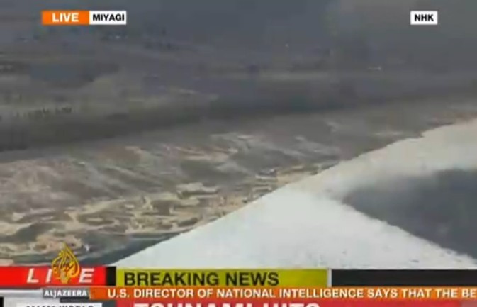 截图显示的是沿海地区遭到地震引发的海啸袭击的情景,大量近海农田被海水