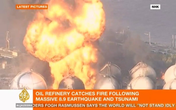 地震震级已调整到8.9级,这是油库起火的实时信息。