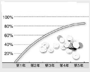 根据图二所示的薪酬曲线,如果员工的绩效为A、连续五年绩效优秀,那么他就有机会达到整个薪酬范围的顶点(即100%);而绩效为B的员工,如果其绩效保持不变,则需要八年才能达到其薪酬曲线的最高值(如80%),以此类推。