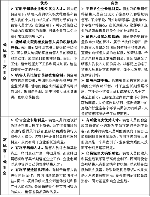 在这三个阶段中,最值得大家注意的是两种典型的薪酬激励方式:"低底薪+高佣金"和"高底薪+低佣金"。现阶段,许多房地产企业在这两种方式之间忽左忽右,犹豫不定。要理清对于特定的房地产企业,对销售人员到底应该采用怎样的薪酬激励手段,需要先认清这两种方式各自的优劣势。