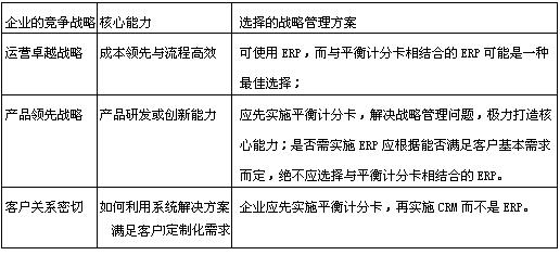 目前许多做ERP软件的企业都开始利用平衡计分卡来完善自己的ERP软件功能,将平衡计分卡的四层面指标考核嵌入到ERP中,硬说自己的ERP包 括了平衡计分卡,结果很多企业误认为只要上ERP就可以了,根本不用实施平衡计分卡。其实,平衡计分卡是公司战略管理工具,而ERP与其相 比仅仅是职能战略管理工具或战术管理工具。实际上企业到底应选择什么样的管理工具,关键看企业向客户提供什么样的独特价值,即选择什 么样的竞争战略。战略不同,要求的核心能力不同,其选择的战略管理方案也不应相同,详见下表: