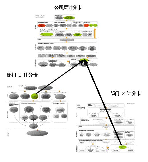 虽然平衡计分卡是一个层级概念,许多企业管理人员误以为公司级计分卡可简单分解成部门计分卡,部门计分卡又可简单分解为个人计分卡。 公司级、部门级与岗位级之间不是简单的叠加关系,而是战略协同关系,是战略目标从上到下的层层落实与从下到上的层层推动,就想钟表一 样,员工比作钟表的秒针,部门为分针,公司是时针。秒针推动分针,分针推动时针,三者之间是一种协同关系。如公司层的战略目标是EVA或 ROI,根据战略协同关系进行分解为营销部为收入、回款等,生产部为成本、流程时间、产量等。下图为某公司的公司层计分卡的战略地图与部 门层计分卡的战略地图,如箭头所示:部门1的战略目标与部门2的战略目标共同支持并推动公司层的战略目标,各部门的战略目标应根据部门 的职能战略来确定,不是简单的分解。