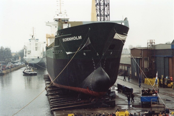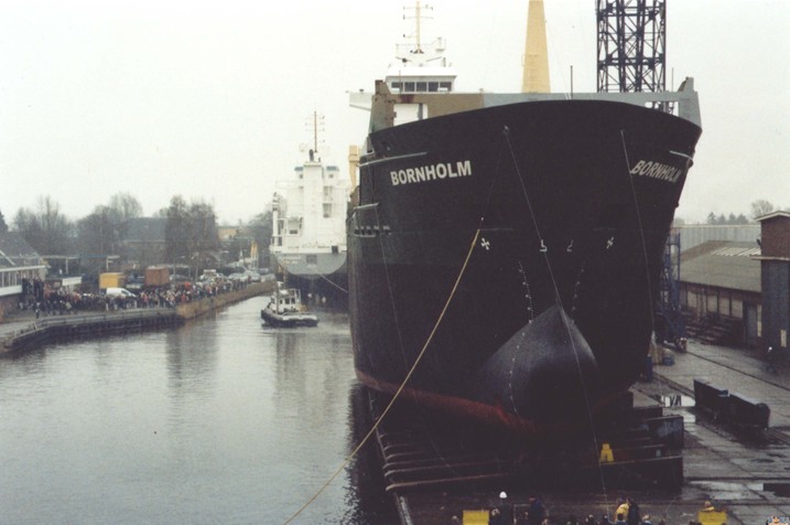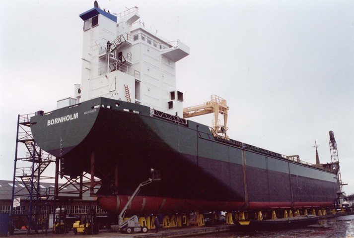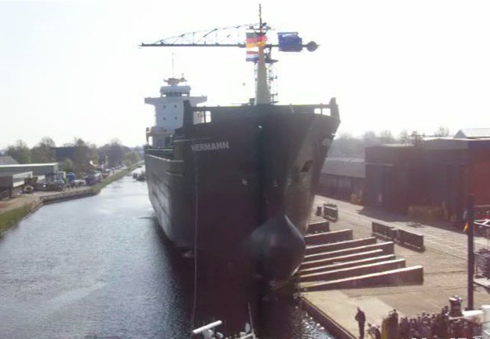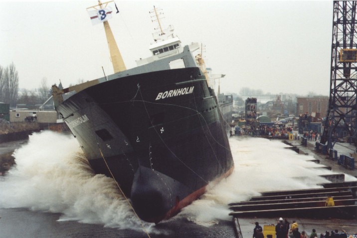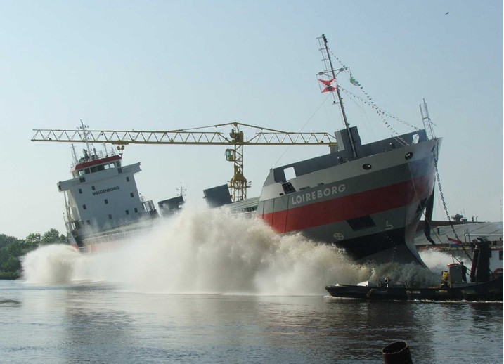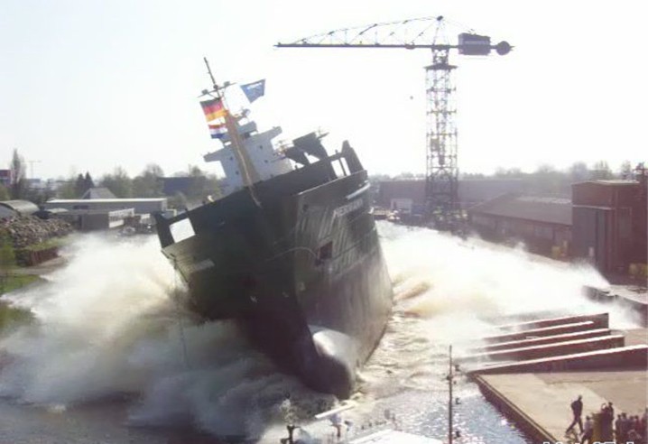 新船侧滑下水,一般适用于中小型船舶。但百十米长,数十米高,由上万吨钢铁构成的庞然大物瞬间倒向水中,激起排空巨浪,又快速自动扶正,几经剧烈摇摆,最后终于驯服地安静下来,这静--动--静的过程,还是給人以强烈的视觉冲击和心灵震撼。所以每条新船下水,都是船厂的节日。